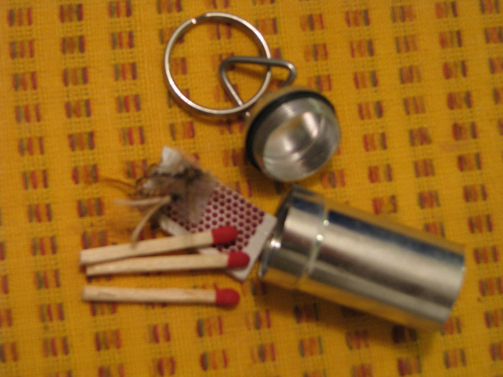 Lastly, I carry a “last ditch” container that is waterproof and contains matches, a length of fishing line, and two dry flies. The container is small pill bottle that goes on your key ring and I bought it at Wal-mart for two dollars. The dry flies are included just in case no bait is available. Otherwise bait could be attached to the hooks. The fishing line is 6 lb test tippet, used in making leaders for trout fishing. A tippet has the advantage of being more invisible than most regular fishing lines.