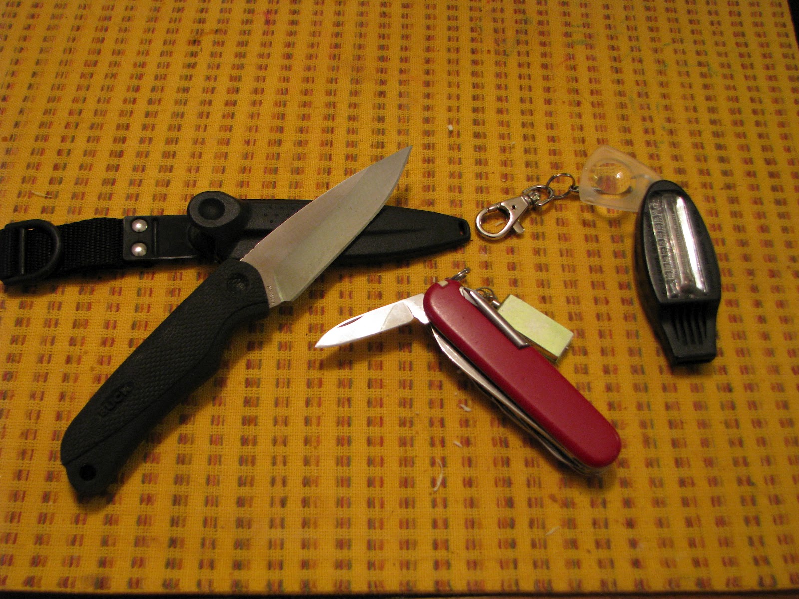 | I usually carry a small fixed blade or more often my Swiss Army knife. Also pictured is a magnifying glass multi-use key chain. |